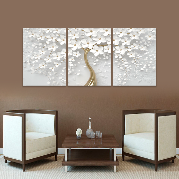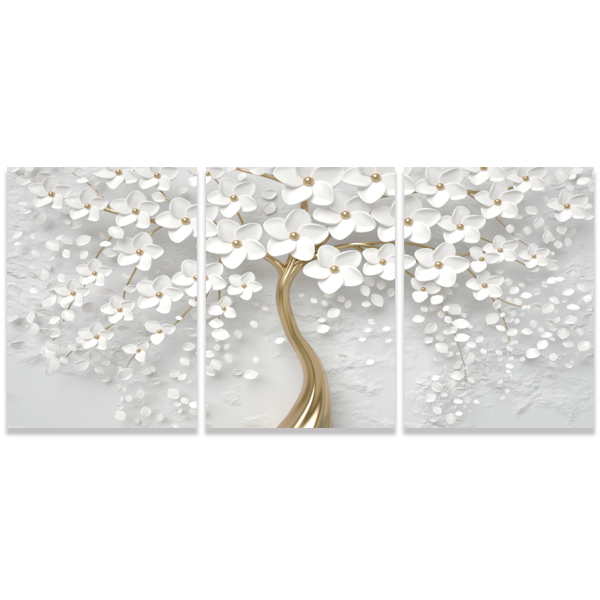 Quadro de arvore dourada com folhas brancas – trio estilo mosaico elegante e moderno para ambientes sofisticados. Este quadro decorativo com a temática natureza e árvore, está disponível em duas versões: canvas e chassis de madeira de eucalipto e canvas com moldura canaleta (branca, preta, tons de madeira).