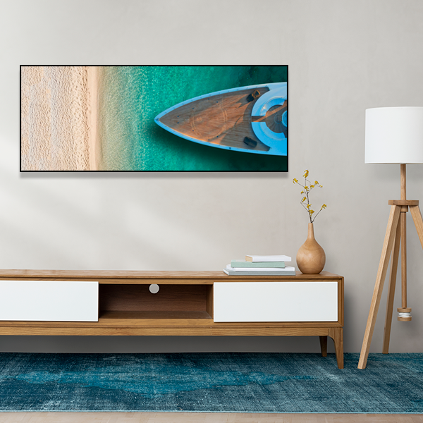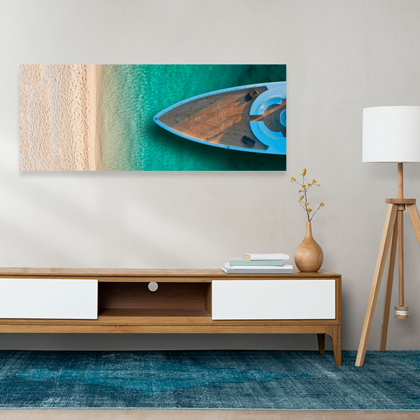 Quadro barcos no mar elegante e moderno para ambientes sofisticados. Este quadro decorativo com a temática de paisagem e deserto, está disponível em duas versões: canvas e chassis de madeira de eucalipto e canvas com moldura canaleta (branca, preta, tons de madeira).
