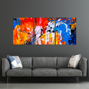 Quadro panorâmico para sala abstrato tons de vermelho e azul em tela canvas com moldura canaleta