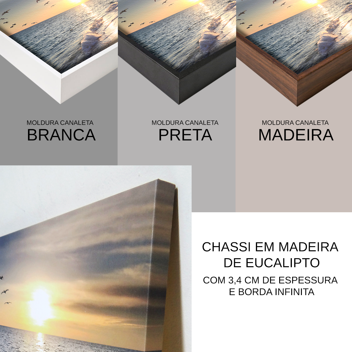 Além da opção de telas com apenas o chassis de madeira em eucalipto, temos a opção com moldura canaleta em três versões: branca, preta e tons de madeira. As molduras dão um toque mais sofisticado no acabamento e agregam valor no acabamento. A moldura canaleta aumenta a área do quadro em 3 cm a mais em cada lado e tem 3 cm de espessura ou profundidade.