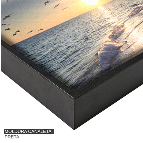 • Moldura Flutuante Canaleta: um acabamento sofisticado que envolve o quadro com uma moldura sutil, criando a sensação de que a tela ?flutua? dentro da estrutura. Disponível nas cores brancapreta e tons amadeirados, a moldura canaleta traz elegância e destaca a obra, combinando perfeitamente com diversos estilos ? do clássico ao moderno.