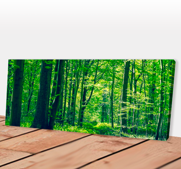 Quadro panorâmico Floresta Verde, elegante e moderno para ambientes sofisticados. Este quadro decorativo com a temática paisagem, natureza e floresta, está disponível em duas versões: canvas e chassis de madeira de eucalipto e canvas com moldura canaleta (branca, preta, tons de madeira).