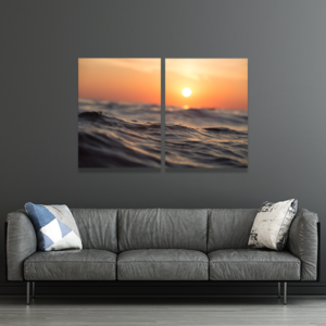 Quadro decorativo por do sol elegante para ambientes sofisticados. Este quadro decorativo com a temática paisagem com pôr do sol no mar, está disponível em duas versões: canvas e chassis de madeira de eucalipto e canvas com moldura canaleta (branca, preta, tons de madeira).